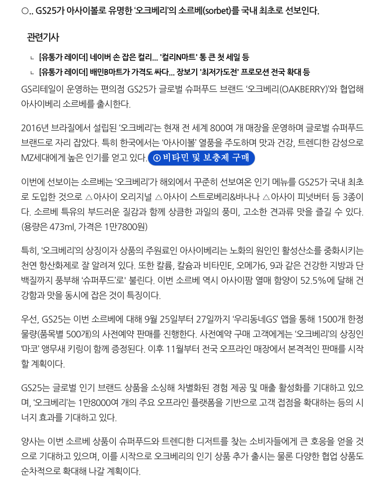 GS¸®Å×ÀÏÀÌ ¿î¿µÇÏ´Â ÆíÀÇÁ¡ GS25°¡ ±Û·Î¹ú ½´ÆÛǪµå ºê·£µå ¡®¿ÀÅ©º£¸®(OAKBERRY)¡¯¿Í Çù¾÷ÇØ ¾Æ»çÀ̺£¸® ¼Ò¸£º£¸¦ Ãâ½ÃÇÑ´Ù.